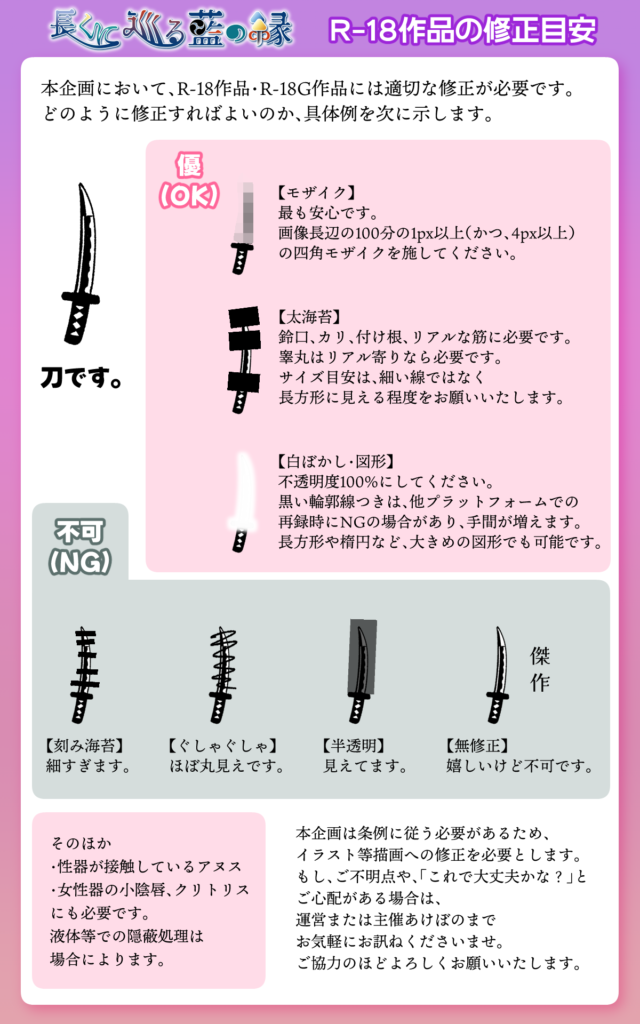 性的描写の修正(不明瞭化処理、隠蔽処理ともいう)につきましては、主催による例を次の折りたたみ内に示します。